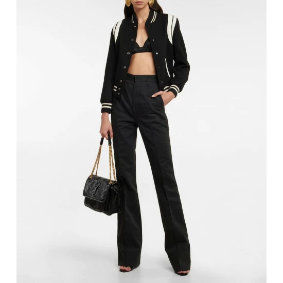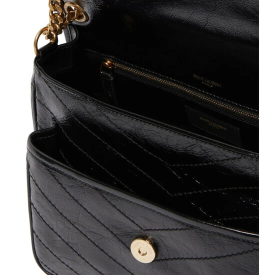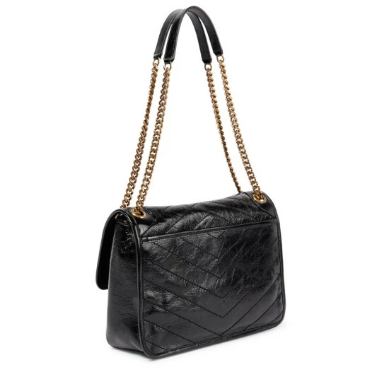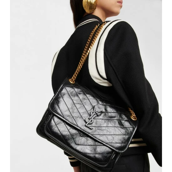Saint Laurent’s iconic Niki Medium shoulder bag is reinterpreted in black chevron-quilted leather. This capacious design features YSL hardware and comes with a chain and leather strap that can be worn in multiple ways.