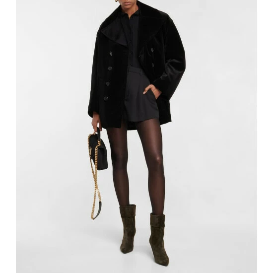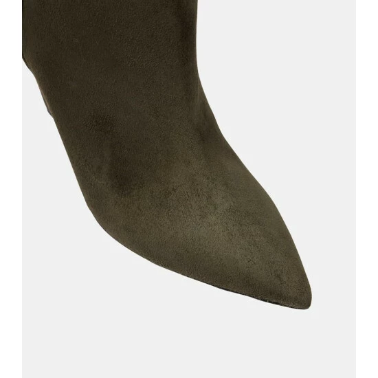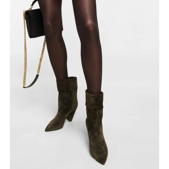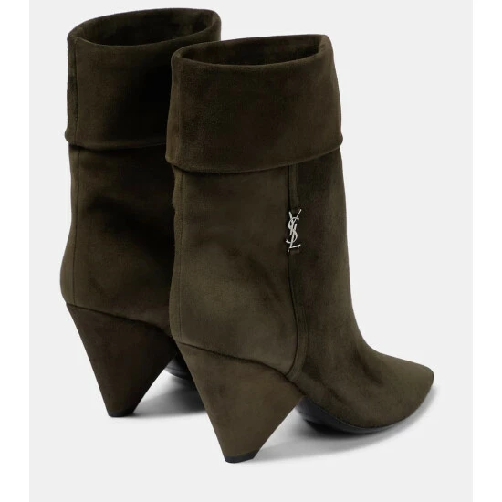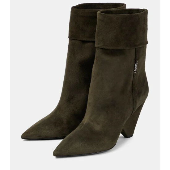 The Niki suede ankle boots from Saint Laurent are made in Italy with folded shafts, pointed toes, and covered cone heels. This style also features the YSL initials in interlocking silver-tone metal on the side.
