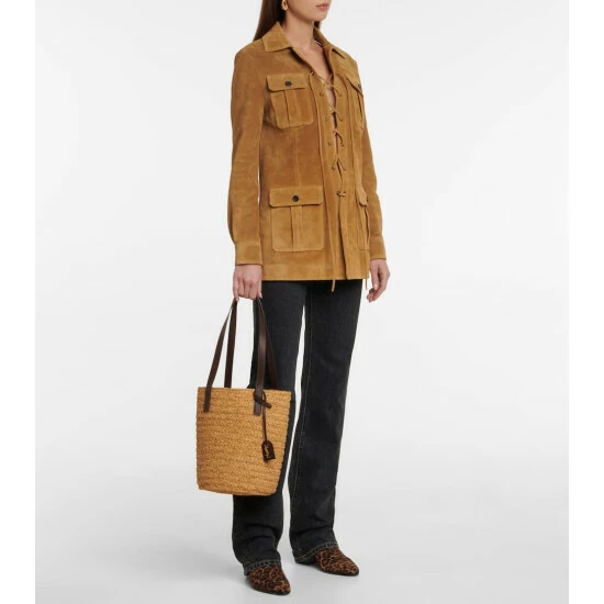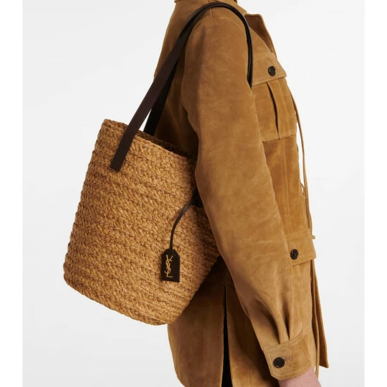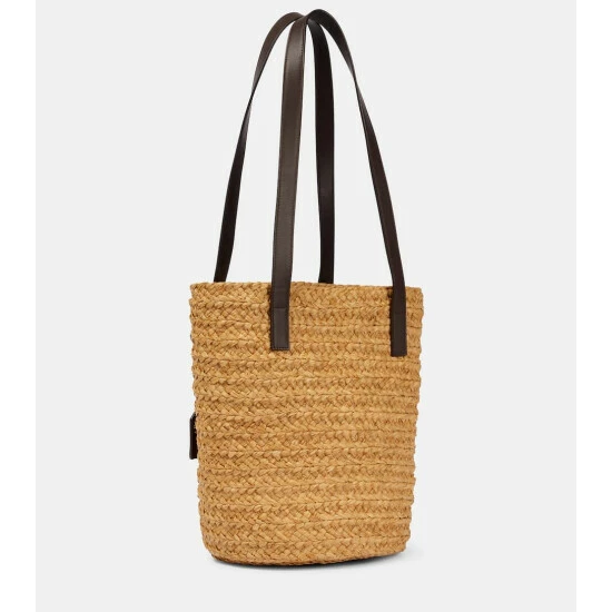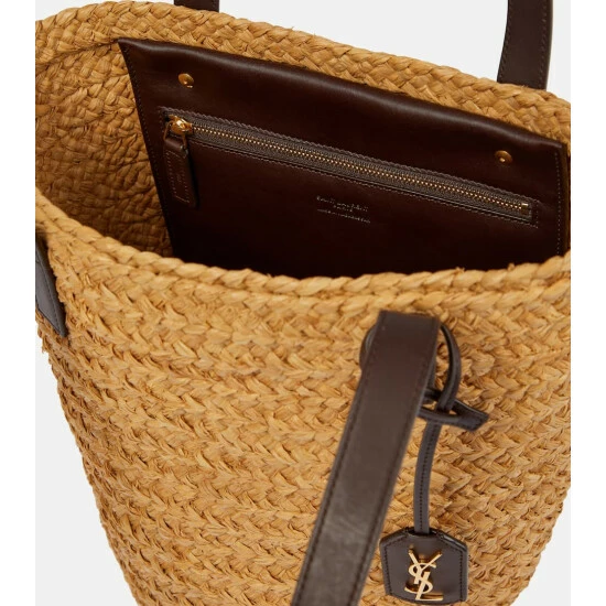 Saint Laurent’s Panier Small bucket bag updates a rustic classic: the basket tote. The woven raffia design has leather trims that include top handles, an inner pocket, and a keychain that’s adorned with YSL hardware.