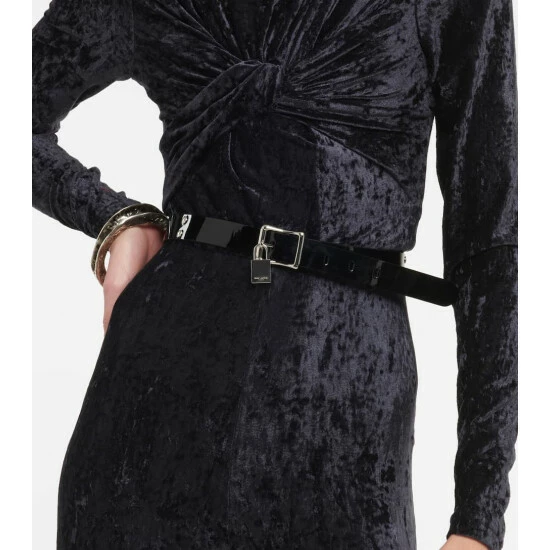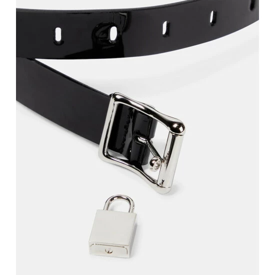 This belt from Saint Laurent is made from black patent leather. It has silver-tone hardware and comes with a padlock buckle detail.