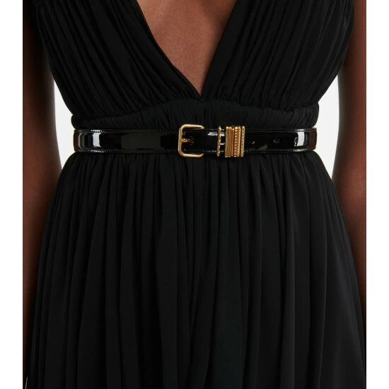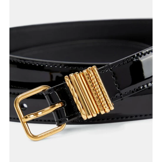 Made from patent leather, this belt from Saint Laurent is embellished with golden metal hardware with ridged detailing.