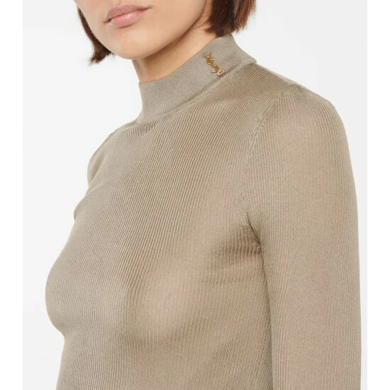 Opt for this fine ribbed-knit beige sweater from Saint Laurent as an elegant base layer. It’s made from soft silk into a close-fitting silhouette, and it is finished with a YSL monogram plaque on its mockneck collar.