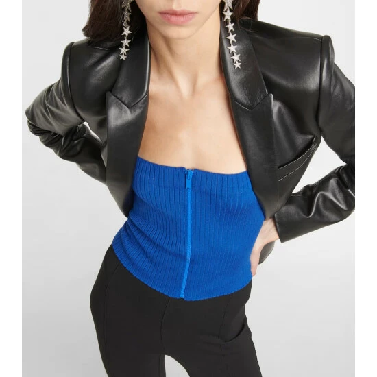 The tube top is officially back this season, if Saint Laurent has anything to say about it. This fitted bustier-inspired style is made in Italy from ribbed wool-blend knit with a matching electric-blue zipper down the front.