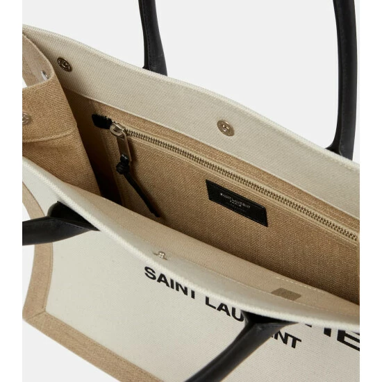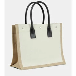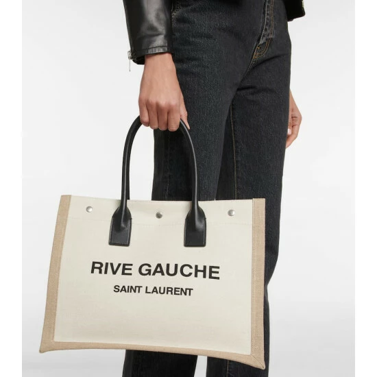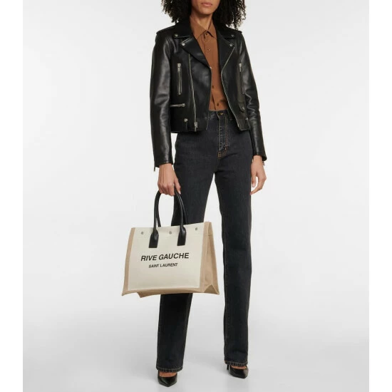 The spacious Rive Gauche tote from Saint Laurent pays homage to the location of the label’s ready-to-wear beginnings. It’s made from white and beige canvas with rolled leather top handles and logo-engraved snap fastenings.