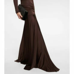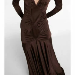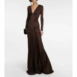 This body-hugging gown from Saint Laurent features elegant ruching along the bodice. Made from lustrous brown jersey, the style has an alluring V-neck, diamond-shaped yokes on the front, and fluid floor-grazing skirt.