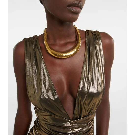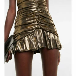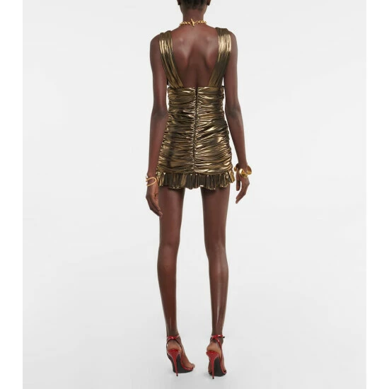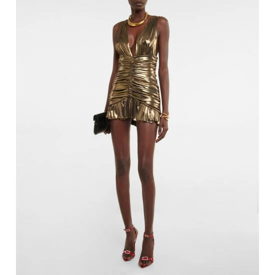 This minidress from Saint Laurent will be an after-party favorite for its gleaming fabrication and plunging neckline. Made from lamΓ© jersey, the ruched design achieves a figure-flattering silhouette and is complete with a frilled hem.
