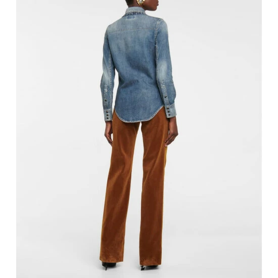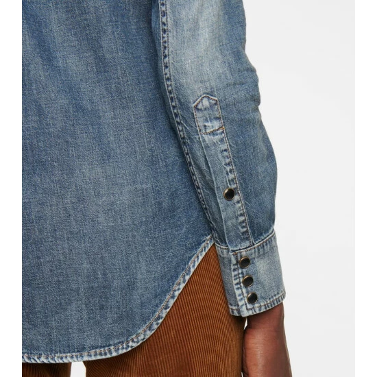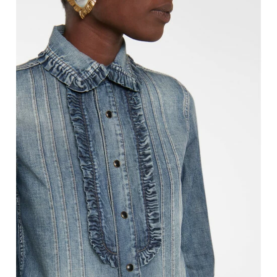 Saint Laurent shows how small design details make all the difference in a denim shirt. This mid-blue cotton design features a ruffled collar and bib which are accented with more pronounced fading.