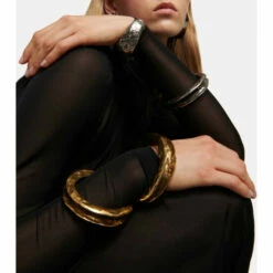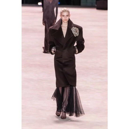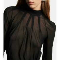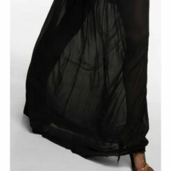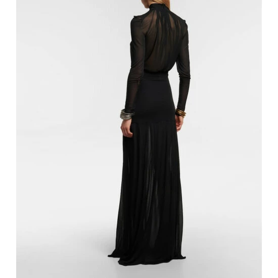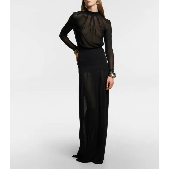 Made from a semi-sheer tulle fabric, this understated gown from Saint Laurent has gathered detailing at the neckline, a fitted waist and a hem that pools on the ground.