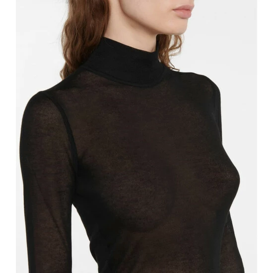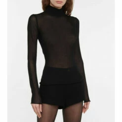 Layer this sheer top from Saint Laurent under one of the house’s iconic blazers or biker jackets. It’s a form-fitting style with a mockneck.