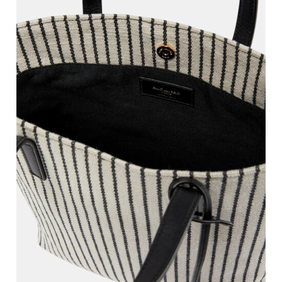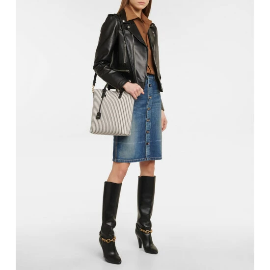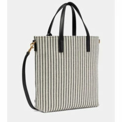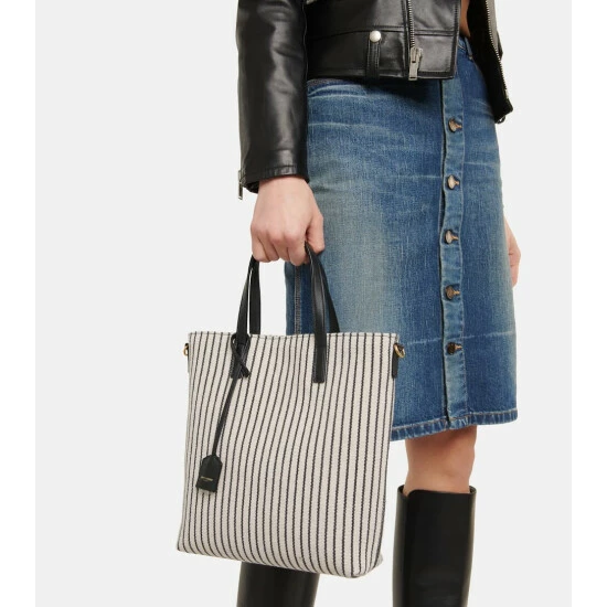 The Saint Laurent woman exudes Parisian sophistication as she saunters along city streets – usually with the Shopping Toy tote in-hand. It’s made from leather-trimmed striped white canvas with a branded tag and detachable strap.