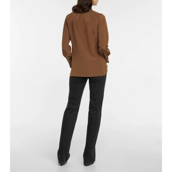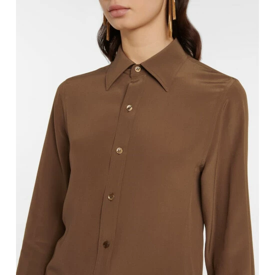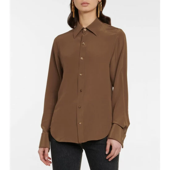 This silk crรชpe de chine shirt from Saint Laurent is a trend-transcending piece. It has an elegantly notched hemline, lustrous Agoya buttons, and golden cufflinks.
