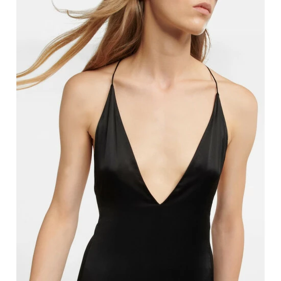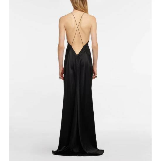 The sun is dimming and the conversation sparkling, but both pause when you arrive in this Saint Laurent gown. Crafted from fluid silk, it suspends from slender straps and is shaped with a low back and high slit.