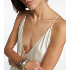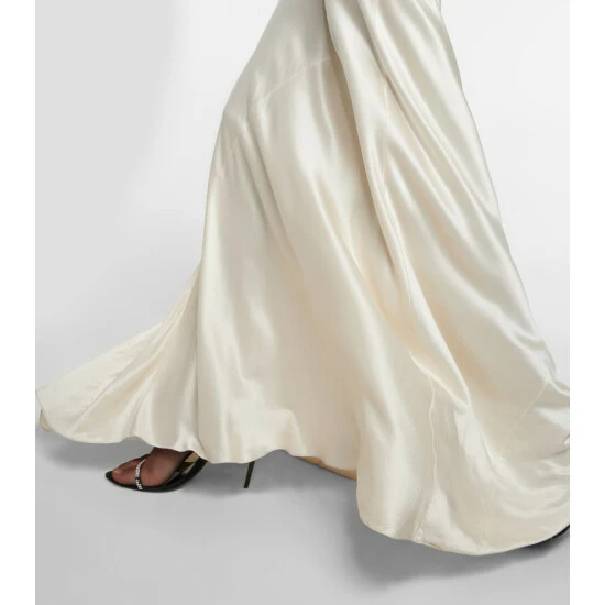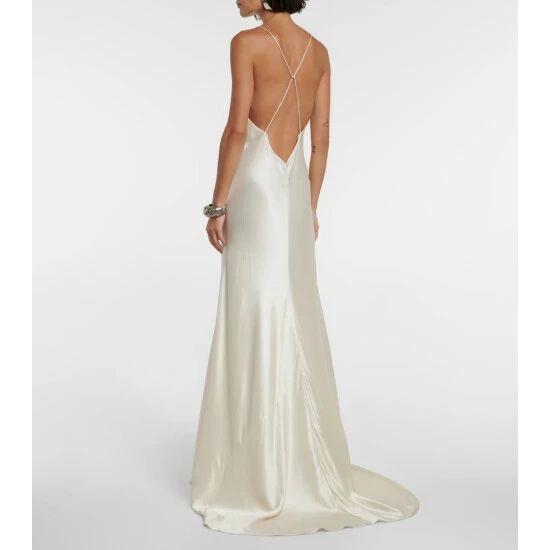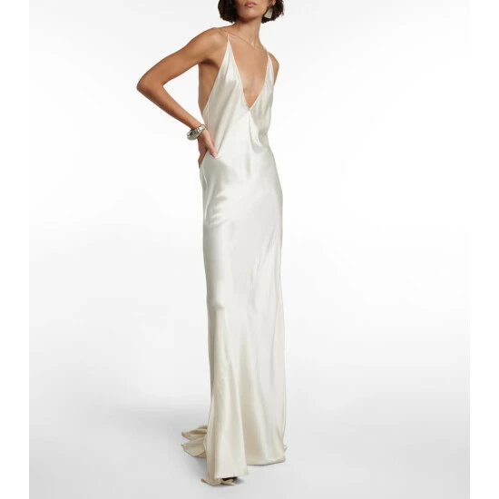 Made from lustrous silk satin, this gown from Saint Laurent hangs from delicate shoulder straps and has a deep v-neck and a lightly flared silhouette.