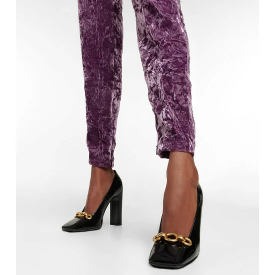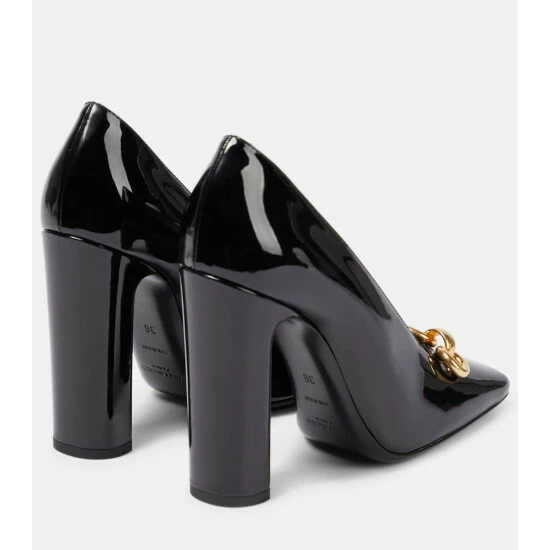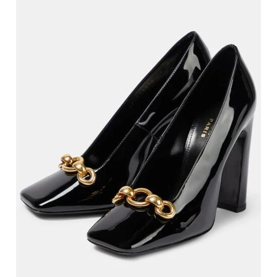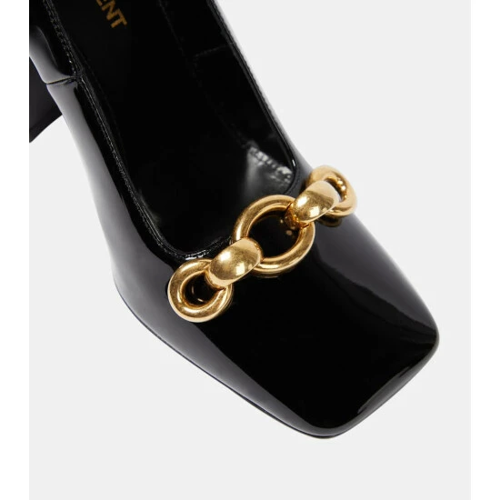 The Silvana pumps appear with Saint Laurentโs trademark polished reverence. This patent leather style has a glossy finish, square toes with anchor chains, and curved heels.