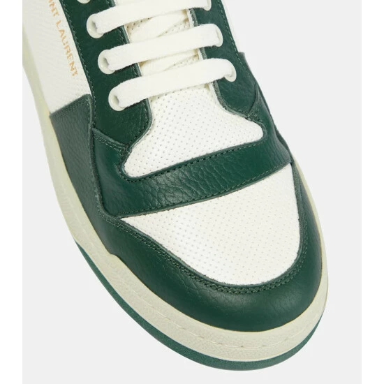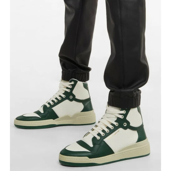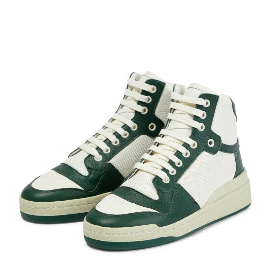 Add some retro flair to your casual looks with Saint Laurent’s SL/24 high-top sneakers. Made from white and green leather panels, they feature perforated uppers with logo detailing and rest on comfortable rubber soles.