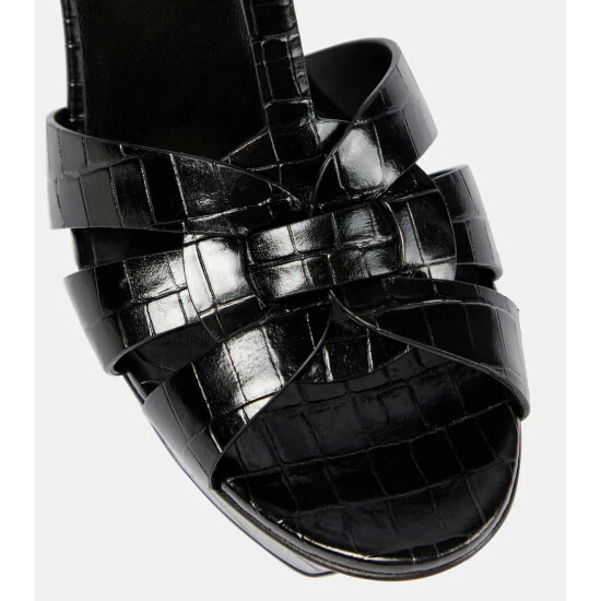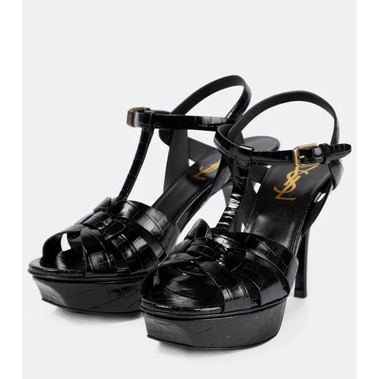Set a new definition for glamour with Saint Laurent’s Tribute sandals. Made from croc-effect, black patent leather, theyโre elevated by platform soles and 105mm stiletto heels, and feature intertwining, caged straps.