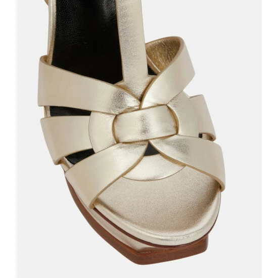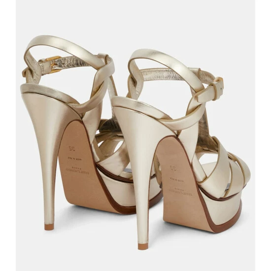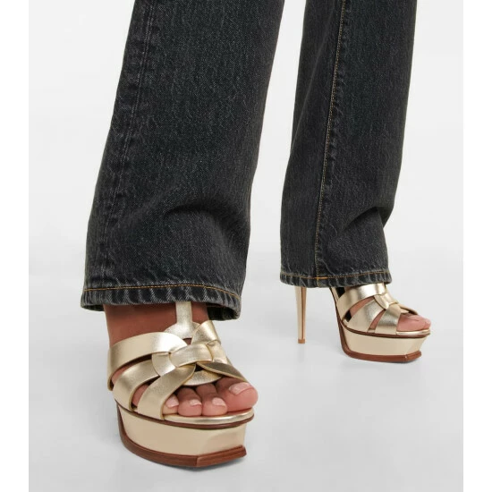 Saint Laurent provides a glamorous riff on the platform trend with the Tribute sandals. Covered in metallic-silver leather, this pair has elegantly caged vamps and rests on towering 135mm stiletto heels for added drama.