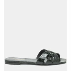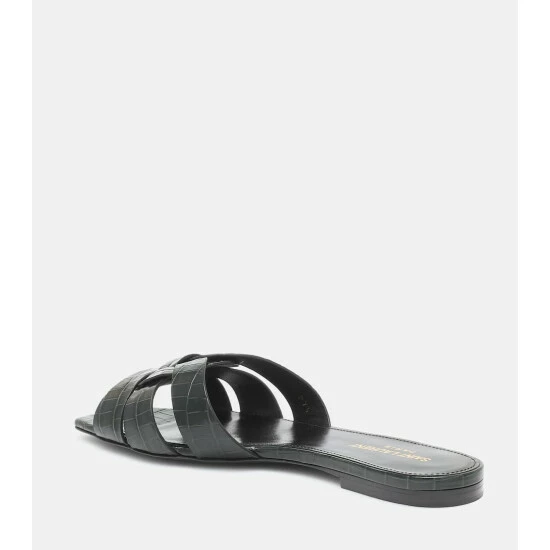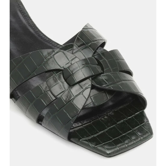 Saint Laurent’s Tribute Nu Pieds 05 prove that flats are just as glamorous โ if not more so โ than heels. Made from deep green leather with croc-effect embossing, they have intertwining Tribute straps that create an effortlessly chic design. Team yours with cropped boyfriend jeans or printed dresses alike.
