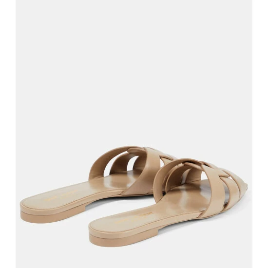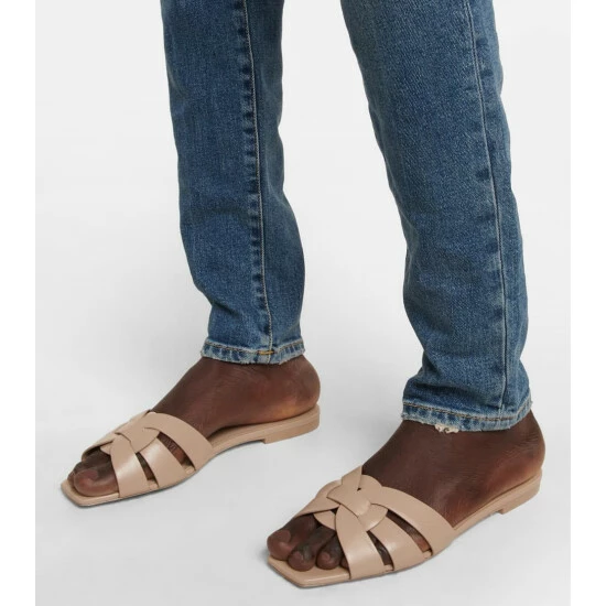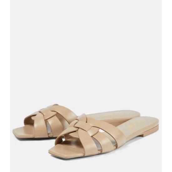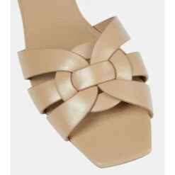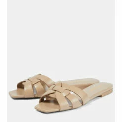 Mixing glamour and ease, Saint Laurent’s Tribute Nu Pieds 05 slides are a masterclass in elegant nonchalance. Made from grained beige leather, they have interwoven straps that form the pair’s namesake motif.