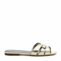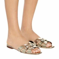 Mixing glamour and ease, Saint Laurent’s Tribute Nu Pieds 05 slides are a masterclass in elegant nonchalance. Crafted in Italy from calf leather in metallic “Platino” gold, the design features intricate weaving at the straps, forming the signature Tribute motif. Make yours a suitcase essential for warm-weather getaways.