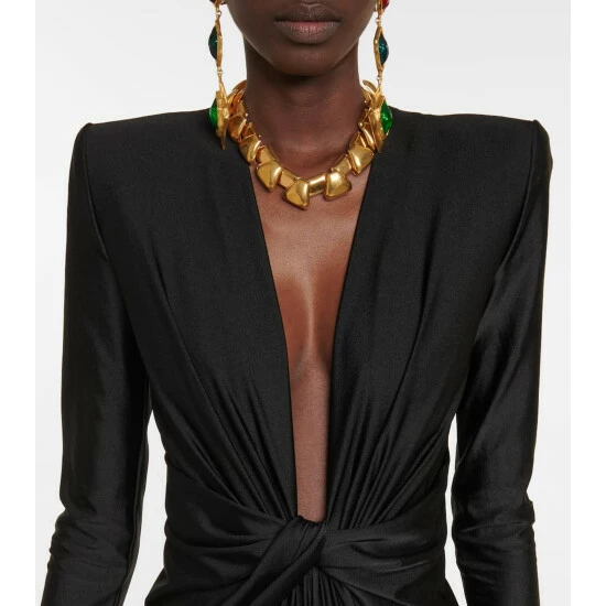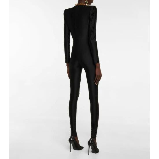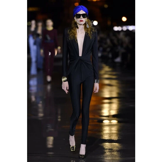 Saint Laurent’s runway collection is a celebration of all things sexy and fresh. This jumpsuit is shaped with power shoulders and precision ruching and features a plunging neckline that ends with a twist detail.