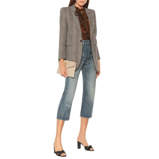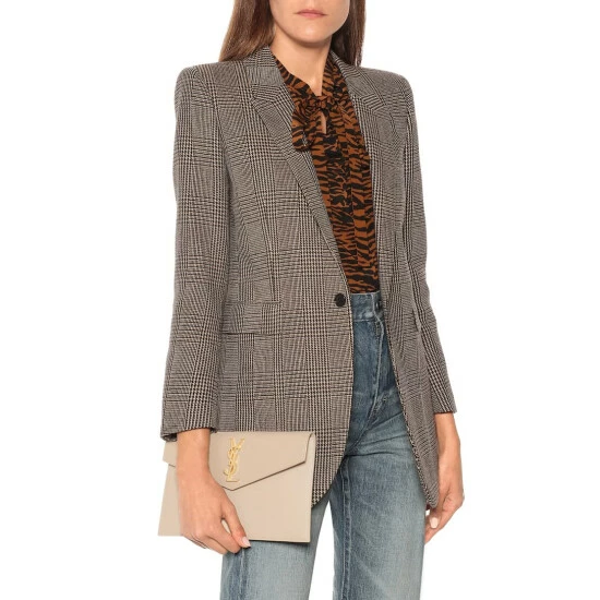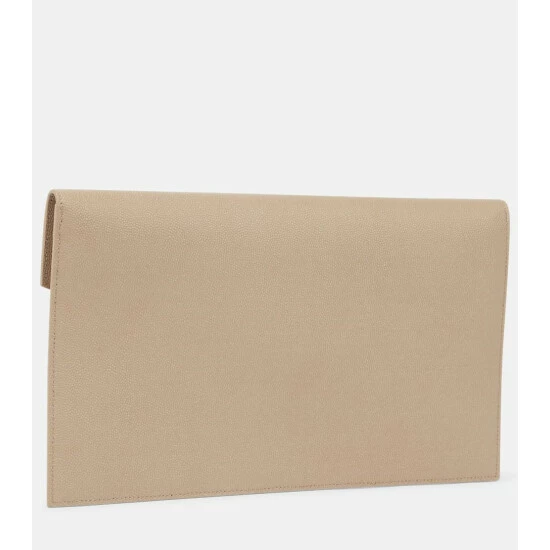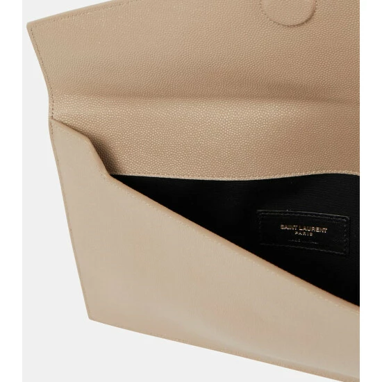 This beige Uptown clutch from Saint Laurent makes for a timeless installment to your accessories rotation. Made in Italy from grained leather, itโs cut to an envelope silhouette with a magnetic flap closure. The labelโs iconic YSL emblem, worked in gold-tone metal, serve as a high-octane finishing touch.
