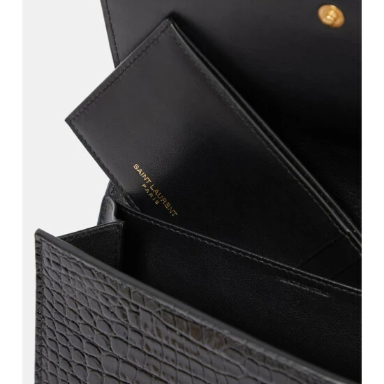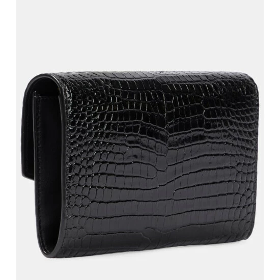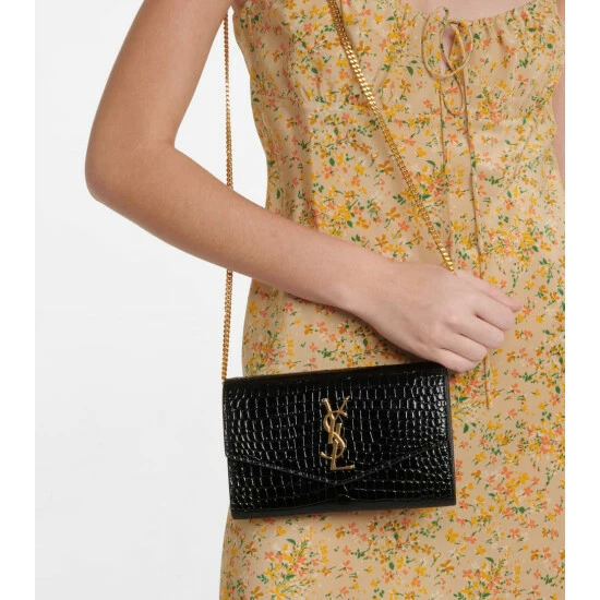 Nothing looks more sophisticated or effortless than a Saint Laurent design. The Uptown wallet on chain is crafted in Italy from croc-embossed black leather and finished with golden YSL hardware and removable chain.
