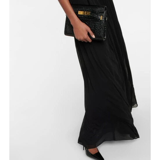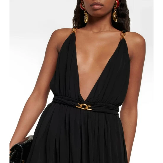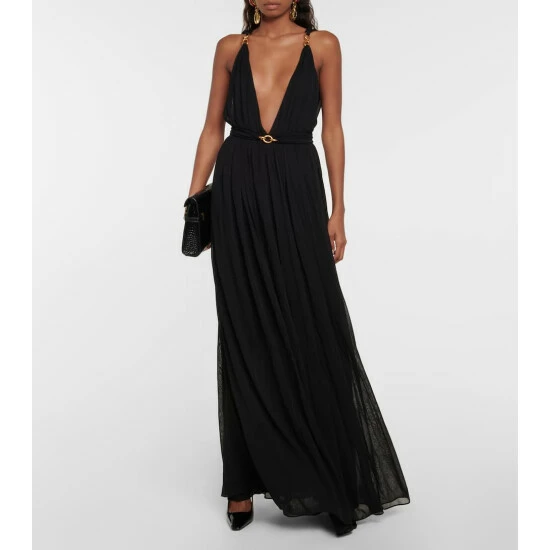 Known for its timeless eveningwear, this gown is classic Saint Laurent. Made from a lightweight fabric with a pleated skirt, this gown has a deep v-neck and a belted waist with golden hardware.