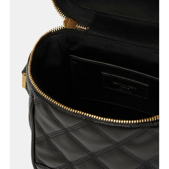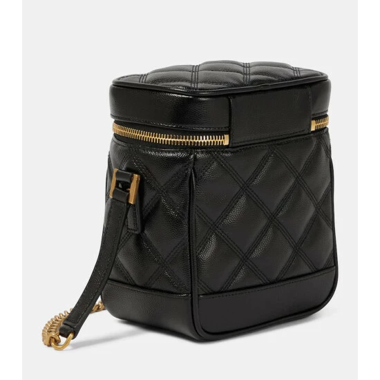 Saint Laurent pays homage to ’80s accessorizing with the Vanity crossbody bag. This hemispherical design is made from diamond-quilted nappa leather and has a golden monogram tag.