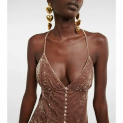 Made from crushed velvet, this minidress from Saint Laurent is cut into a skin-baring V-neck. Hanging from delicate spaghetti straps, the gently flared design is embellished down the front with fabric-covered buttons.