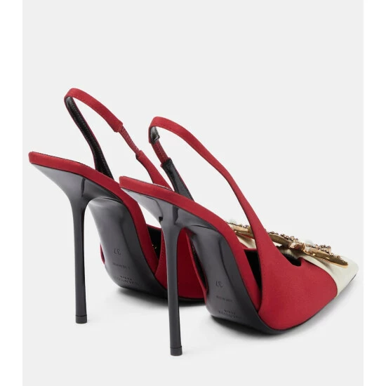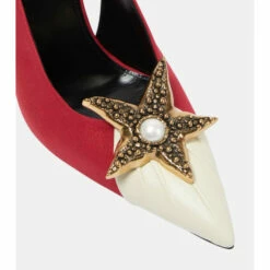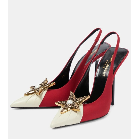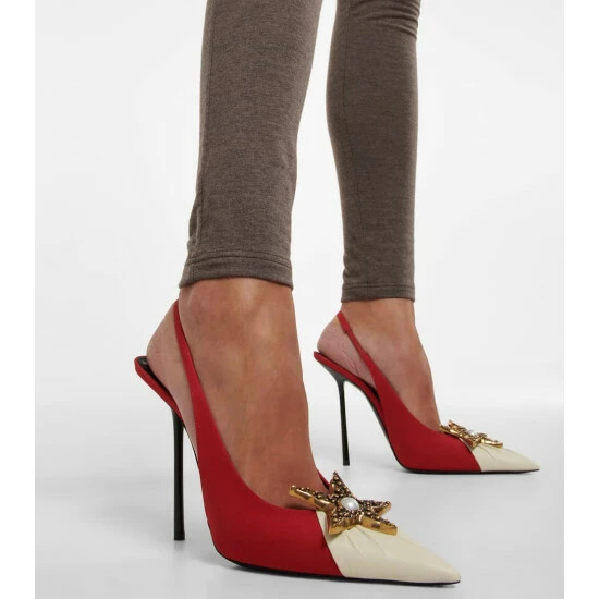 The Volver slingback pumps from Saint Laurent will finish off any ensemble with an alluring, retro flair. Made from crêpe de chine and leather, the two-toned style is embellished with a gold-tone star and draped detail at the toe.