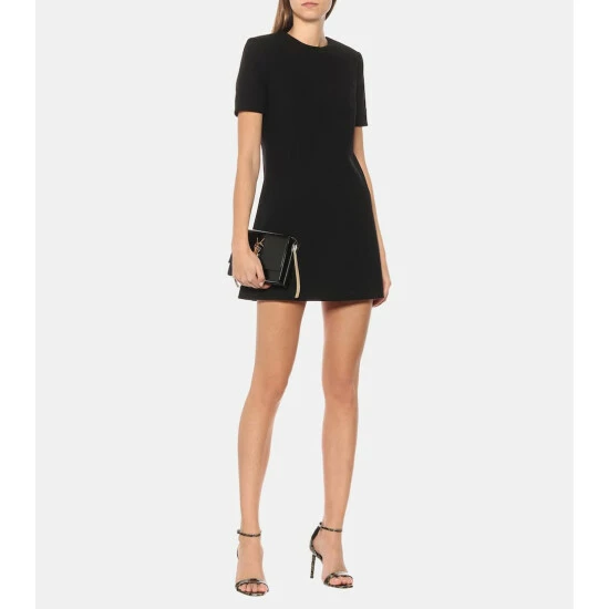 This black wool minidress from Saint Laurent is a seasonless essential for the modern woman. It is crafted in France with a T-shirt style upper, a fitted waist, and a charmingly flared miniskirt. Wear yours now with tights and ankle boots.