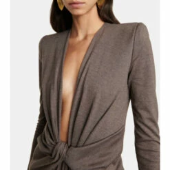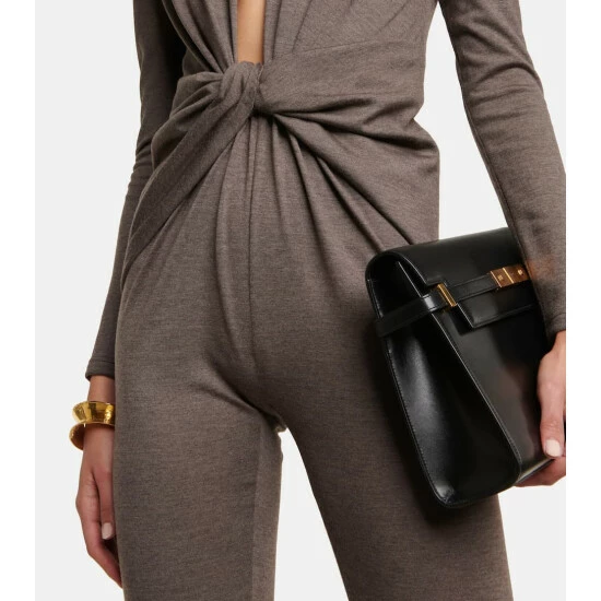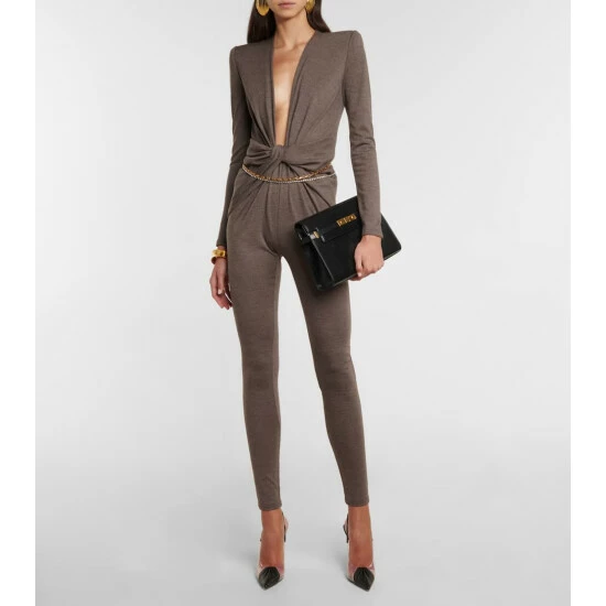This sexy jumpsuit from Saint Laurent is shaped with a plunging neckline that ends in twists of fabric at the waist. It’s made from wool jersey in a close-fitting silhouette.